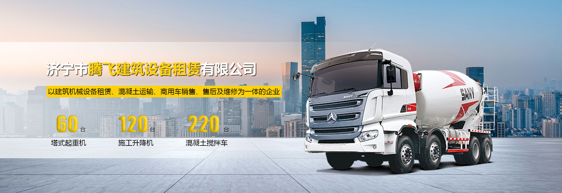 濟(jì)寧市騰飛建筑設(shè)備租賃有限公司成立于2011年8月23日,注冊(cè)資金2000萬(wàn)元,是一家以建筑機(jī)械設(shè)備租賃、混凝土運(yùn)輸、商用車(chē)銷(xiāo)售、售后及維修為一體的企業(yè)。